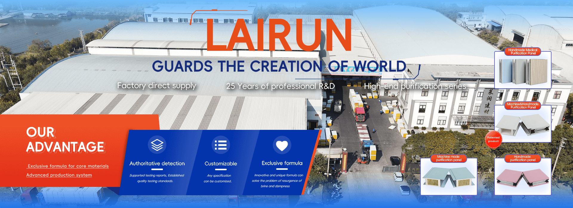 Avec plus de 25 ans d'expertise dans la R& D, LAIRUN’ son fondateur dirige une équipe de 30 vétérans de l'industrie avec plus de deux décennies d'expérience. Créée officiellement sous la marque LAIRUN le 31 octobre 2012, la société a continuellement développé ses capacités, ajoutant neuf lignes de production automatisées de pointe et obtenant neuf brevets pour des produits et équipements innovants. LAIRUN est spécialisé dans les panneaux de salles propres de haute performance, y compris la laine de roche de qualité médicale, le magnésium en verre, l'oxysulfure de magnésium et les panneaux de laine de roche en magnésium en verre.